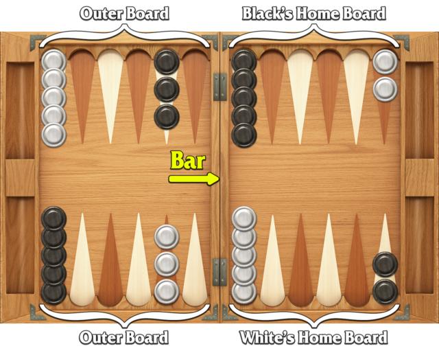 - Board: Divided into four quadrants, each with six points, named as home, outer board (yard), opponent's home, and opponent's outer board (yard). The bar separates home and outer board.