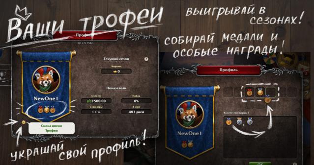 Ну и последнее важное изменение о котором стоит сказать. Мы добавили возможность улучшать ваш штандарт в профиле. Побеждая в турнирах, лидируя в сезонах или получая подарки от друзей, вы приобретаете специальные значки - трофеи. Есть желание продемонстрировать свои игровые успехи или настроение, то используйте ваши трофеи.